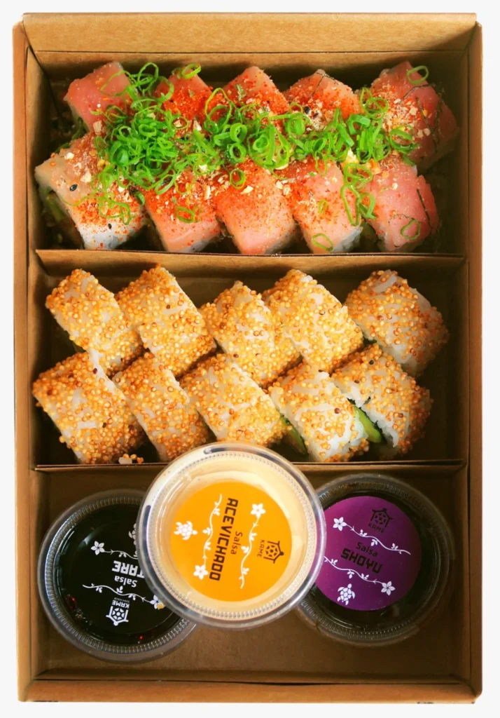 Variedad de Platos: Desde nuestros frescos sushis hasta sashimis deleitantes, cada bocado está preparado con los ingredientes más selectos y un toque de amor que solo se encuentra en Kame Sushi House.