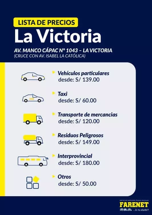 El Centro de Revisiones Técnicas FARENET® La Victoria está ubicado en Av. Manco Cápac N° 1043, La Victoria 15033, Perú. Este establecimiento cuenta con un horario de atención diseñado para adaptarse a tus necesidades. Abrimos de lunes a sábado, desde las 8:00 hasta las 18:00 horas, y ofrecemos atención al cliente los domingos previa cita. En cada visita, te aseguramos un servicio profesional y eficiente, cumpliendo con todas las normas de seguridad y calidad necesarias.